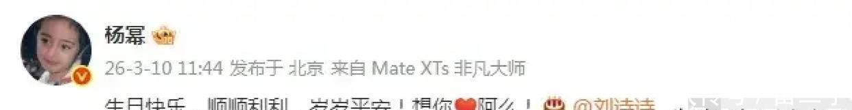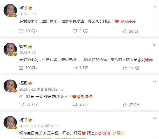 3月10日那天,刘诗诗生日。放眼全网,谁都没杨幂这么准时又有心。11:44卡点发博,字不多,但句句暖心:生日快乐,顺顺利利,岁岁平安!最后还加了句“想你阿么!”这不到几十个字瞬间把她俩送上热搜,一时间让网友纷纷感叹,这份友情是真的有点东西!有人说,这娱乐圈心机多、套路深,友谊就像速食方便面,用一次凉一次。但杨幂和刘诗诗好像是个例外。这不是今年才突如其来,也不是摆拍或者营业,她已经连续五年卡着点为刘诗诗庆生,祝福也从来没用过模板。这种持久且走心的关系,放在哪儿都格外惹眼。很多网友直接感慨:这种长情,五五开分它一半不亏!